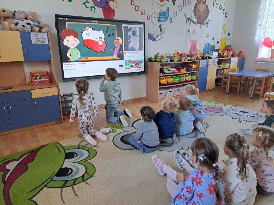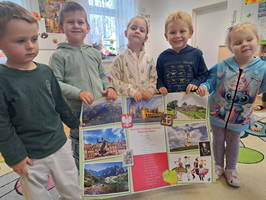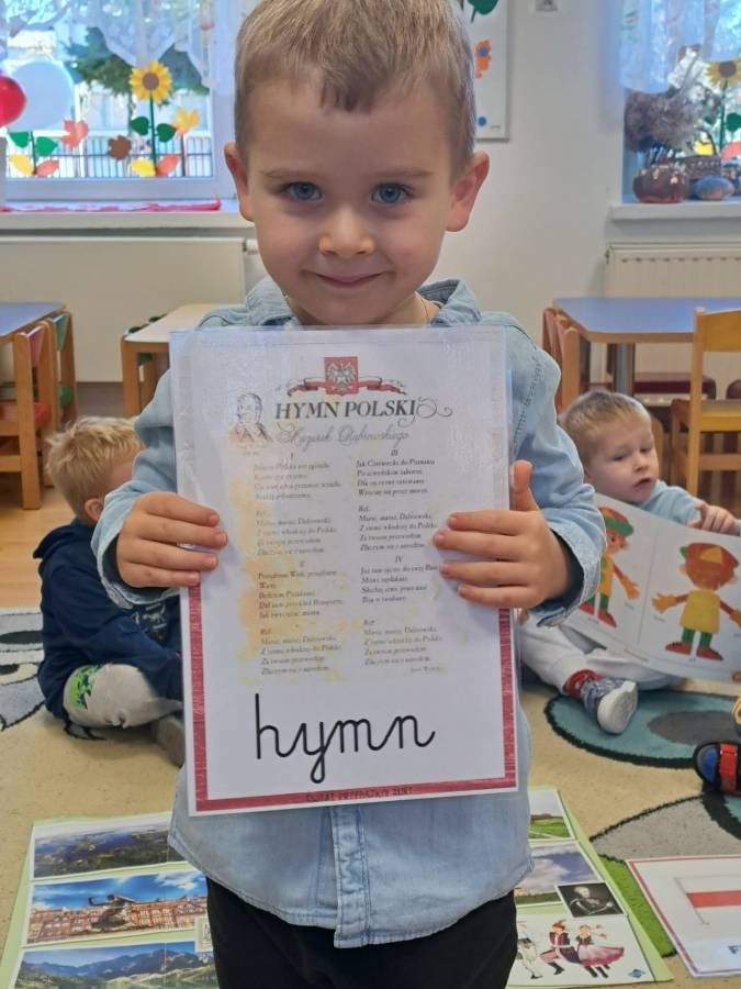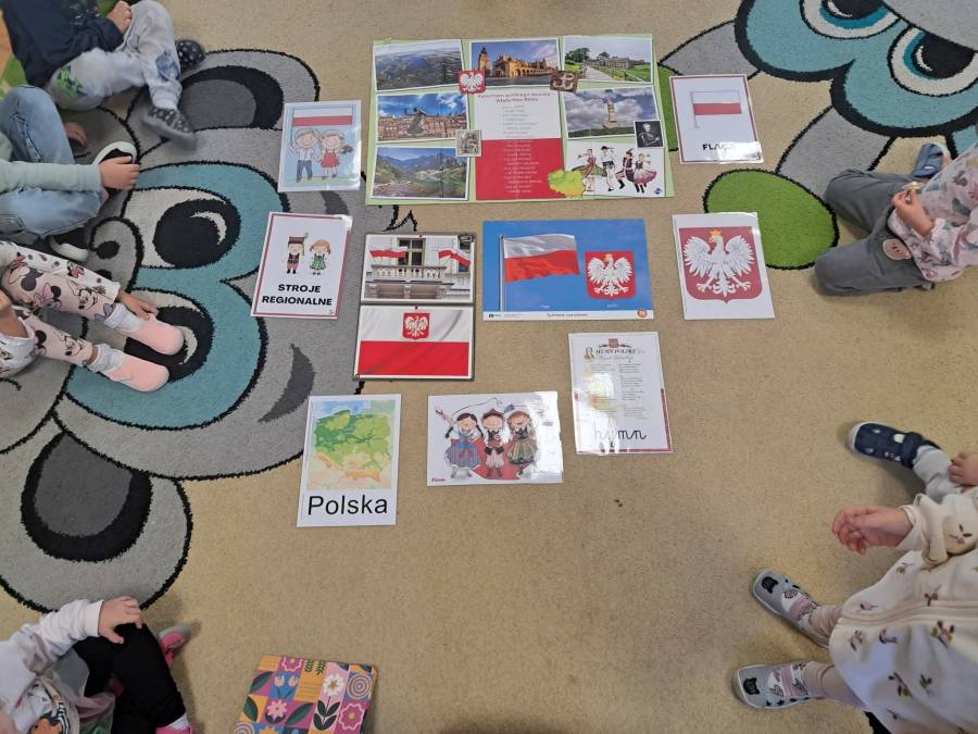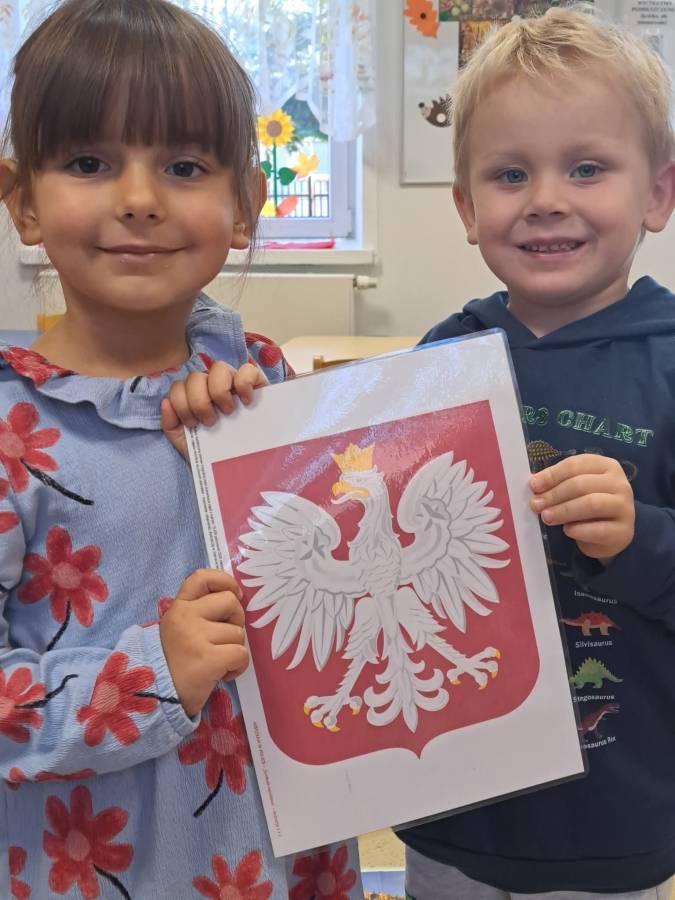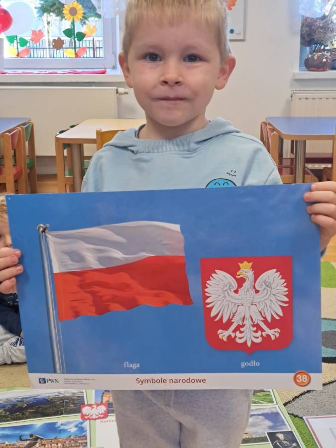 Poznajemy symbole narodowe. Dzieci dowiedziały się między innymi, dlaczego w godle Polski umieszczony jest orzeł, co symbolizują kolory na fladze Polski oraz kiedy można usłyszeć hymn państwowy.